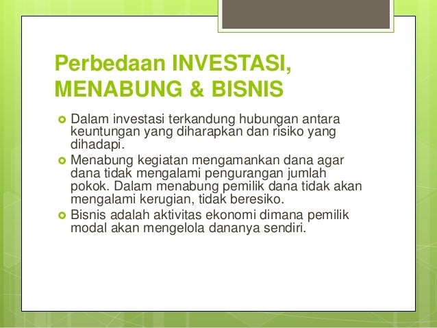 Perbedaan menabung dan investasi alasan yang membedakan investasi dan menabung berbeda adalah besarnya dana yang diperlukan untuk menggapai target yang diharapkan oleh orang tersebut hasil dari pengumpulannya penentuan waktu kebutuhan dimana uang atau lainnya dipakai ataupun disimpan dalam waktu tertentu rencana pencapaian nilai yang. Kalau investasi 3 5 tahun.