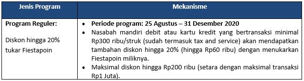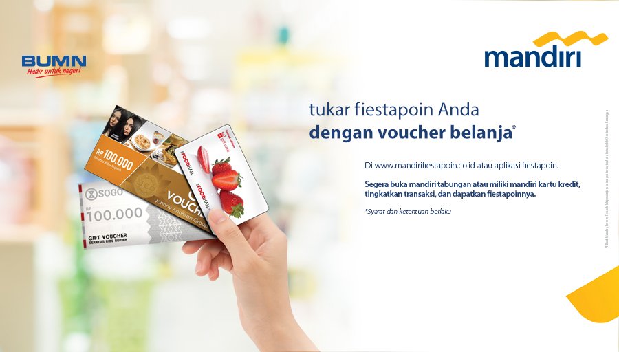 Setiap transaksi dengan kartu bank mandiri kapanpun dimanapun termasuk di luar negeri anda akan mendapat fiestapoin yang bisa anda tukar langsung dengan berbagai barang yang anda butuhkan di semua tempat belanja bertanda fiestapoin sesuai dengan jumlah reward anda. 1 juni 2019 sd 31 mei 2022. Hemat hingga rp 2 juta.